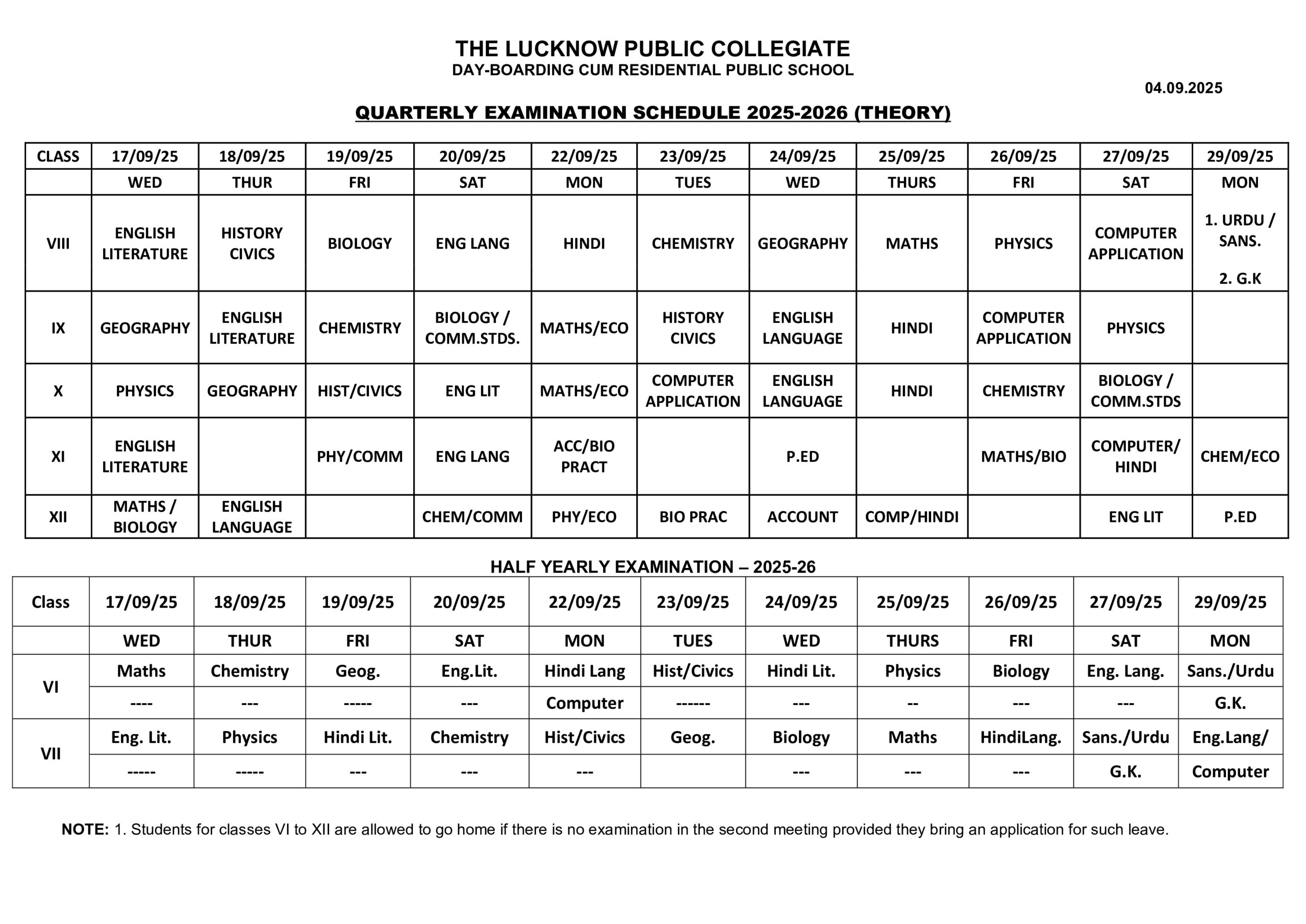 Notice/CircularQuarterly Examination Schedule 2025-2026 (Theory) Unit Test 2 For Classes Nur to V UNIT TEST - 1 AND PERIODIC TEST -1 SCHEDULE FOR CLASSES NURSERY TO VII PRE-QUARTERLY EXAM SCHEDULE FOR CLASSES VIII TO X & XII Holiday Homework Classes NURSERY to V Holiday Homework Classes VI to XII Final Examination Schedule 2024-2025 Winter Vacation Holiday Homework for classes Nur-9 & 11. Download Below PRE-QUARTERLY EXAM SCHEDULE FOR CLASSES VIII TO X & XII UNIT TEST - 1 AND PERIODIC TEST -1 SCHEDULE FOR CLASSES NURSERY TO VII